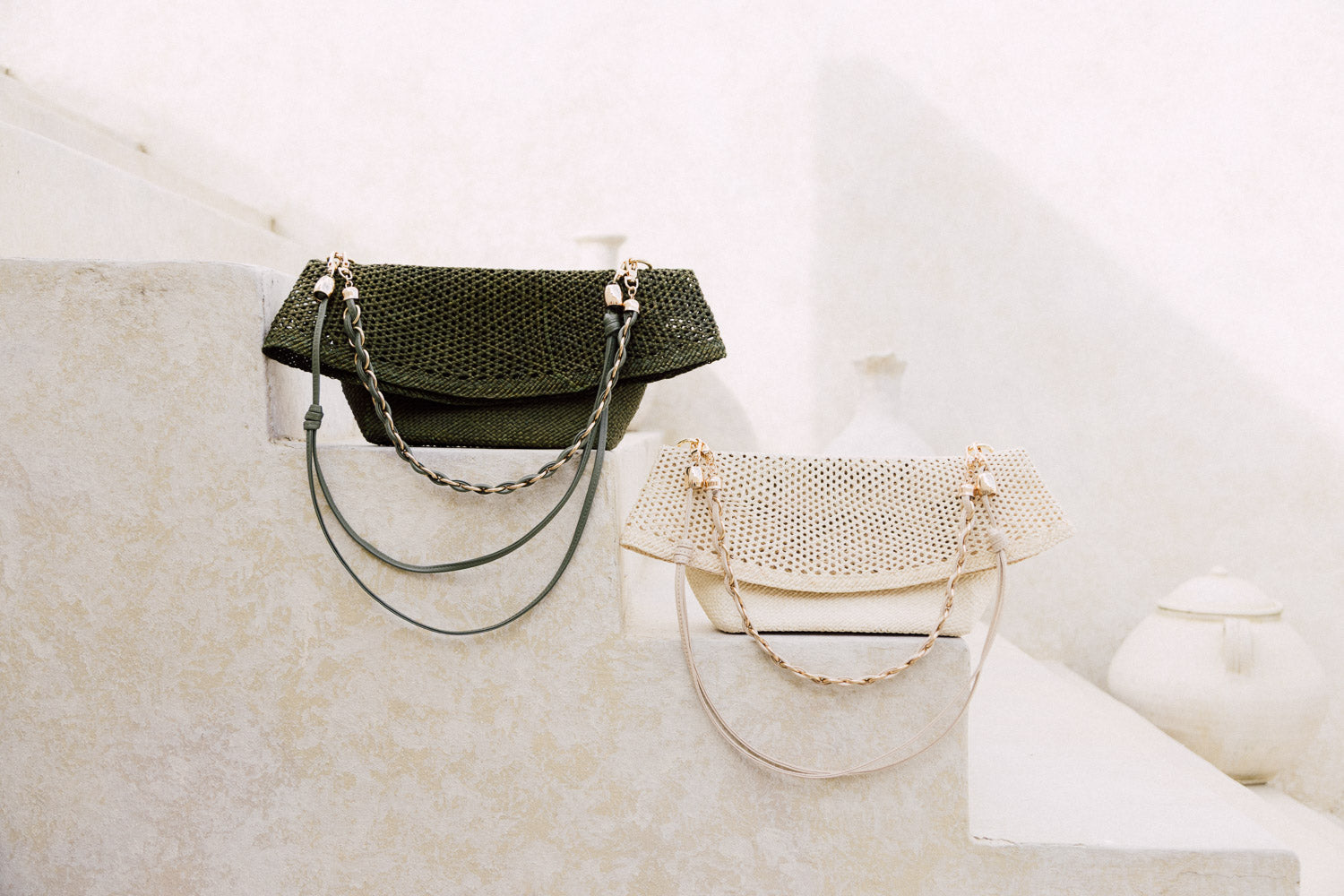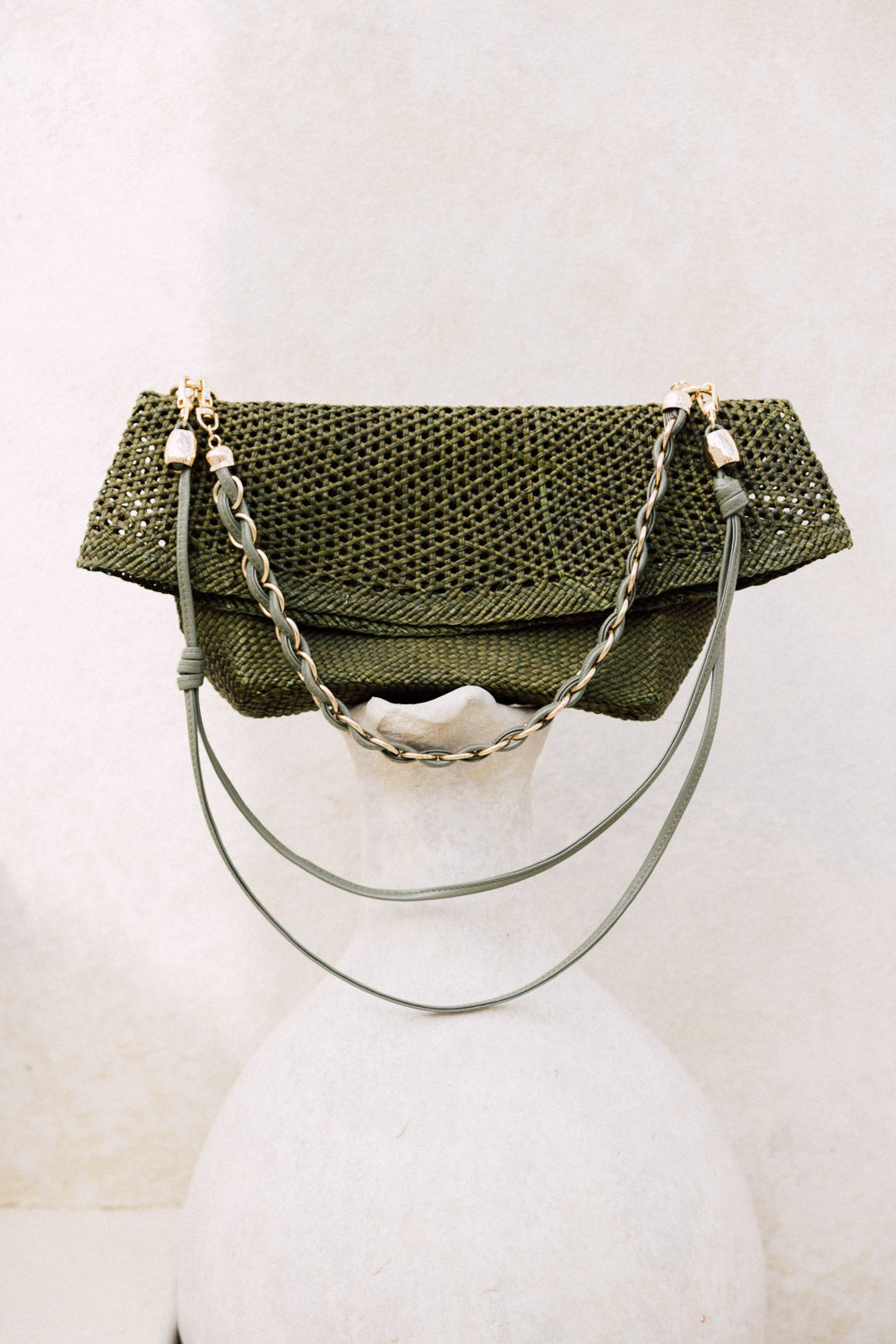 Bolso tejido en hojas de palma color verde oliva por artesanos colombianos.