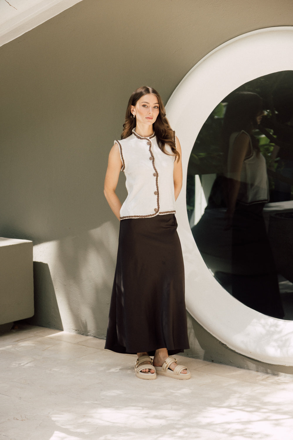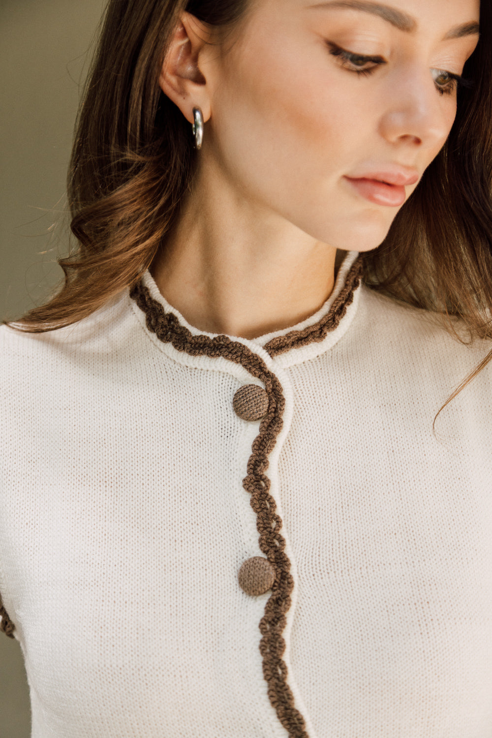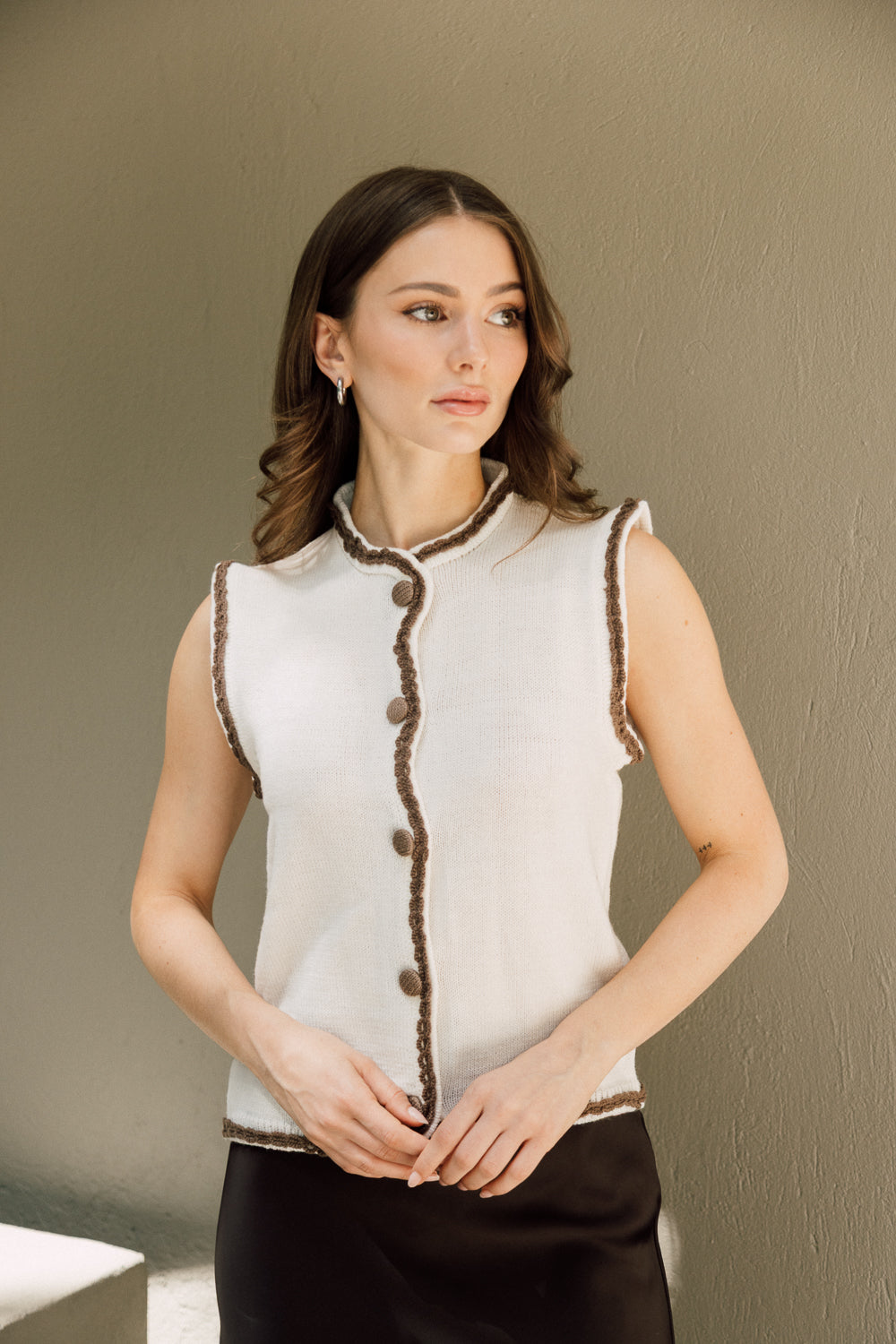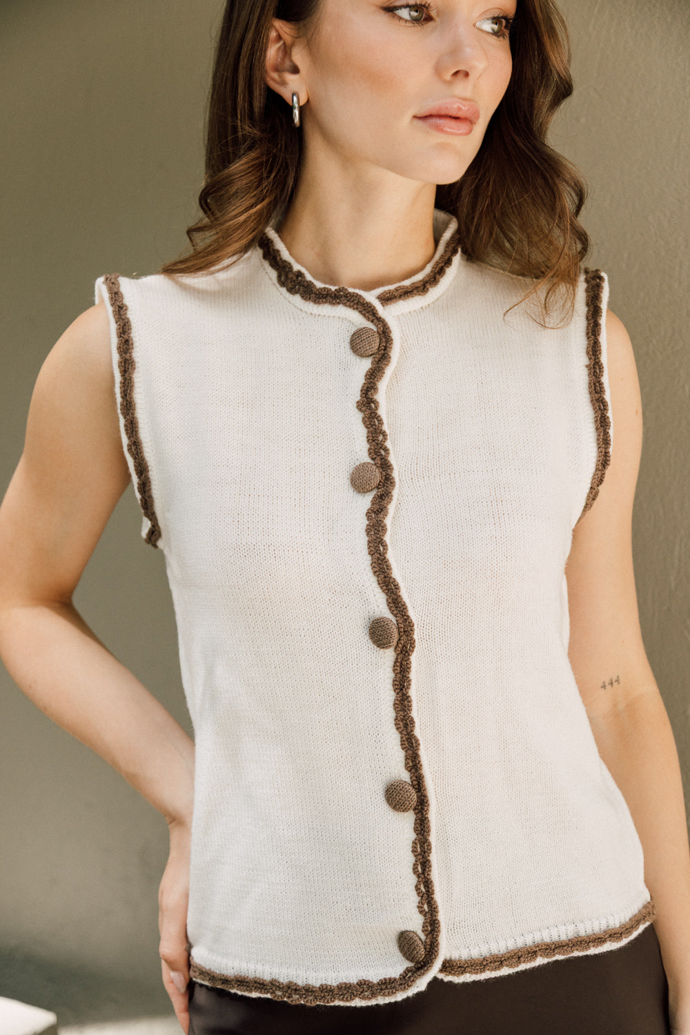 Chaleco tejido por manos artesanas en color beige y borde en crochet color café. Botones forrados.